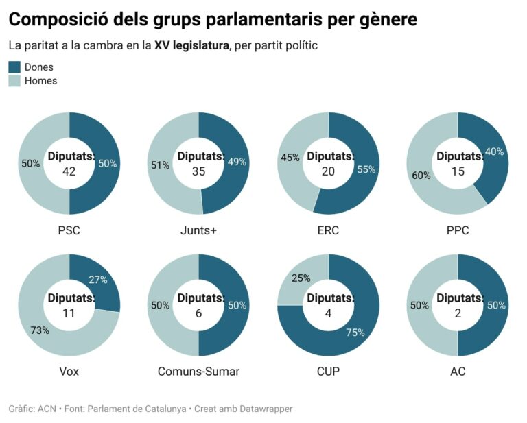 Per grups, els més paritaris són el PSC, amb 21 homes i 21 dones; els comuns, amb 3 diputats i 3 diputades, i Aliança Catalana, que s’estrenarà a la cambra catalana amb un diputat i una diputada. També hi ha formacions amb més presència femenina que masculina. ERC tindrà 11 diputades i 9 diputats i la CUP ha obtingut quatre escons: tres ocupats per dones i un que serà per a un home.