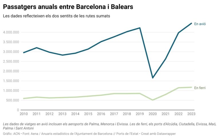 El total de passatgers entre Barcelona i les Balears comptant ferri i avió, i totes dues direccions, va ser de 5.625.952 l’any passat. Es tracta d’un rècord històric des de, com a mínim, el 2010, quan comença la sèrie històrica. Els 1,1 milions de viatges en ferri el 2023 representen el doble que 13 anys abans, mentre que els 4,4 milions de bitllets d’avió són un 51% més que els 2,9 milions del 2010.