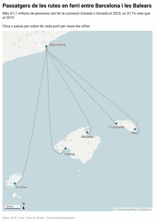 Per illes, Mallorca és la més popular, ja que és l’origen o destí de més de la meitat tant de vols com de viatges en ferri en connexió amb Barcelona, mentre que Menorca i Eivissa es reparteixen l’altra meitat gairebé a parts iguals –mentre que la primera s’imposa en vaixell, la segona li guanya la partida en tràfic aeri.