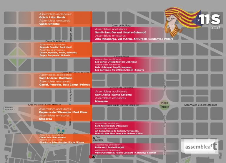 Des de les 17:14h, la manifestació recorrerà diferents punts entre els carrers Pau Claris, Via Laietana i el passeig d’Isabel II. Aquests espais es poden consultar al web de l’ANC i no cal inscriure’s prèviament. La intenció de l’ANC és evitar que es produeixin aglomeracions amb els manifestants al mateix punt.