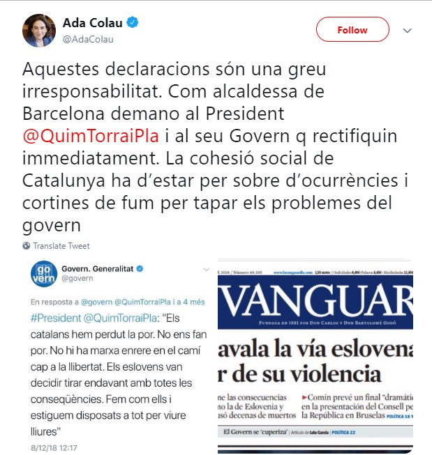 La piulada de l’alcaldessa de Barcelona utilitzant la portada de La Vanguardia contra el govern del president Torra és una mostra més del tarannà populista del seu moviment. Malgrat que tothom sap que la via eslovena a la independència va ser profundament democràtica i que van ser els serbis els culpables dels morts, Ada Colau ha instrumentalitzat la portada del diari monàrquic per excel·lència per atacar el govern independentista català.