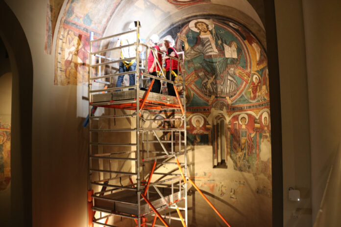 El MNAC ha finalitzat aquest dijous la incorporació de fragments de pintura mural al conjunt romànic de Sant Climent de Taüll després de tres setmanes de restauració. Aquesta és la primera de les accions que recull el projecte ‘Més Romànic’, que preveu completar tres dels conjunts d’art romànic més importants del museu. Al mural de Sant Climent de Taüll se li ha incorporat la figura de Caín, que fins al moment s’havia exposat de manera individual a la mateixa sala, i alguns fragments pictòrics conservats a les reserves de l’entitat. Els restauradors començaran els pròxims dies les tasques d’integració als murals de Sant Pere de Burgal i Sant Joan de Boí, que duraran fins a l’octubre.