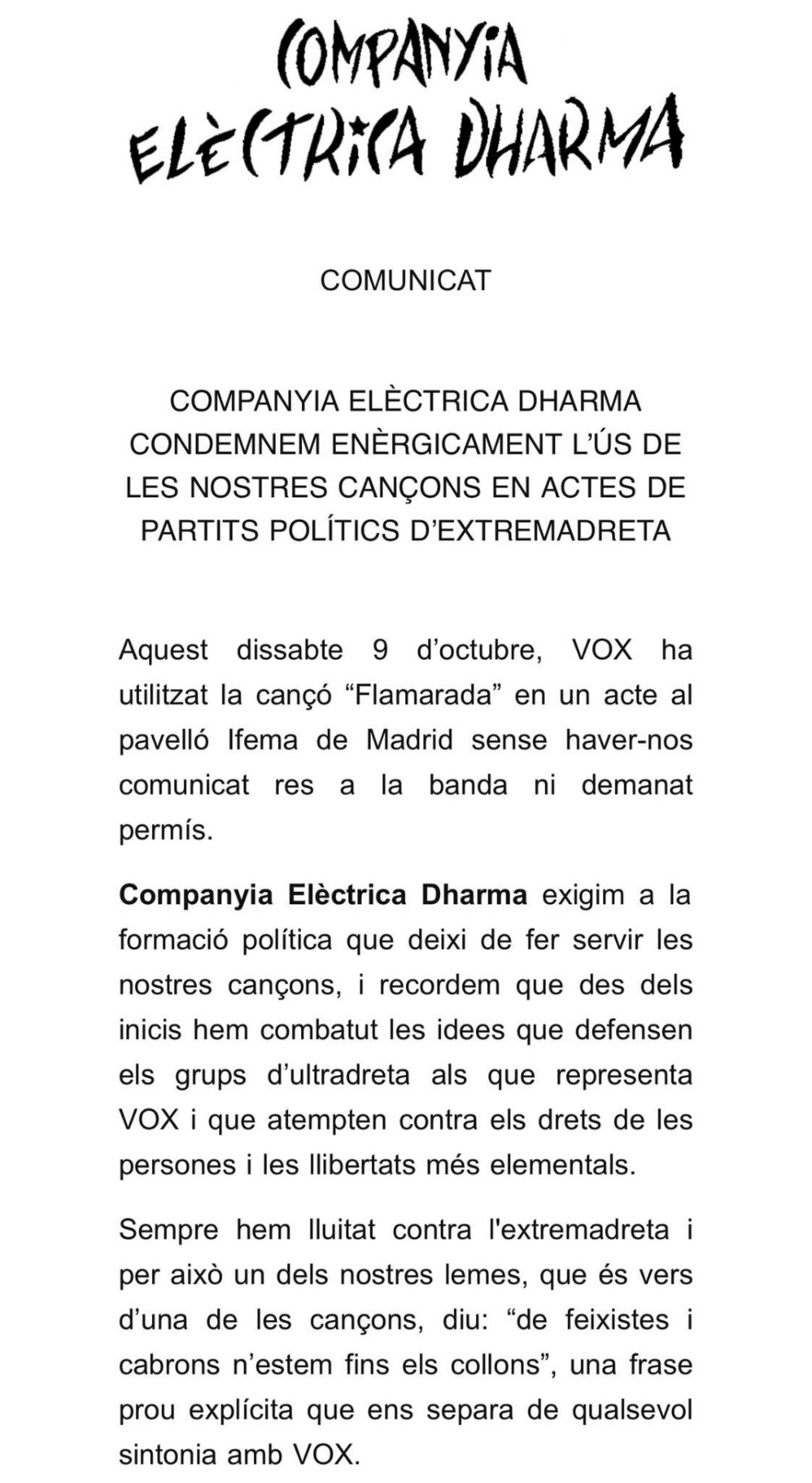 La Companyia Elèctrica Dharma ha denunciat i condemnat “enèrgicament” l’ús de la cançó ‘Flamarada’ en un acte de Vox ahir dissabte al pavelló Ifema de Madrid. La banda exigeix a la formació política que deixi d’utilitzar-la i recorda que repudia la ideologia d’ultradreta. “De dels inicis hem combatut les idees que defensen els grups d’ultradreta als que representa Vox i que atempten contra els drets de les persones i les llibertats més elementals”, ha apuntat en un breu comunicat la Dharma, que posa d’exemple un dels seus lemes –que és vers d’una de les cançons- que diu “de feixistes i cabrons n’estem fins als collons”. “Una frase prou explícita que ens separa de qualsevol sintonia amb Vox”, ha apuntat la formació. Vegeu el comunicat: