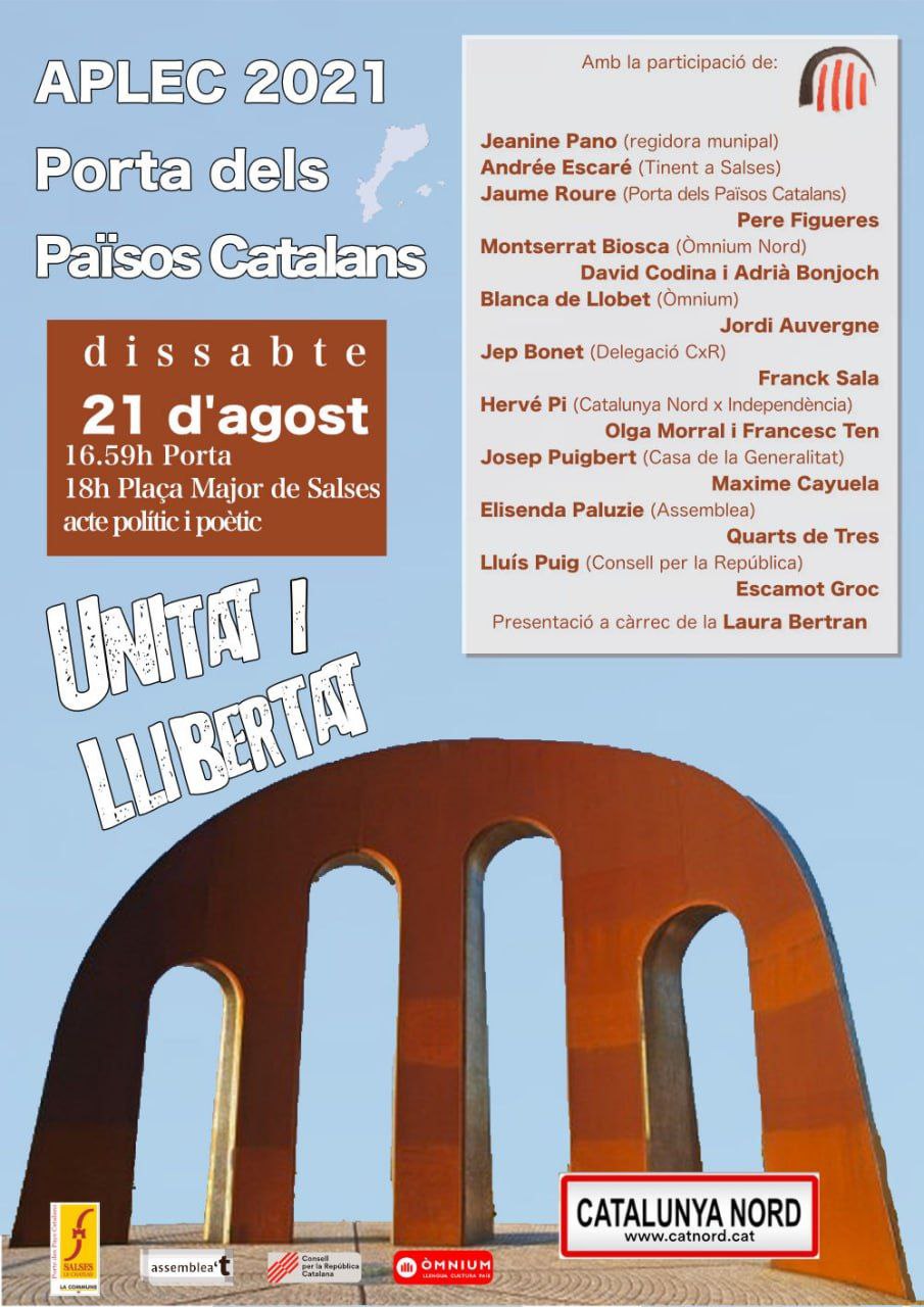 El missatge polític l’ha sintetitzat Elisenda Palouzie: “Sabem d’on venim i on anem: a culminar el procés d’autodeterminació dels Països Catalans” i el cultural el conseller legítim del ram i ara exiliat malgrat estar lliure de tot càrrec segons la justícia europea, Lluís Puig: He treballat per la cultura i la llengua tota la vida. Quan soc aquí, amb tots aquests amics de la cultura catalana, soc a casa”. El programa de l’aplec ha dividit en dues parts, la primera sota l’escultura “Porta dels Països Catalans” i la segona a la plaça major de Salses: