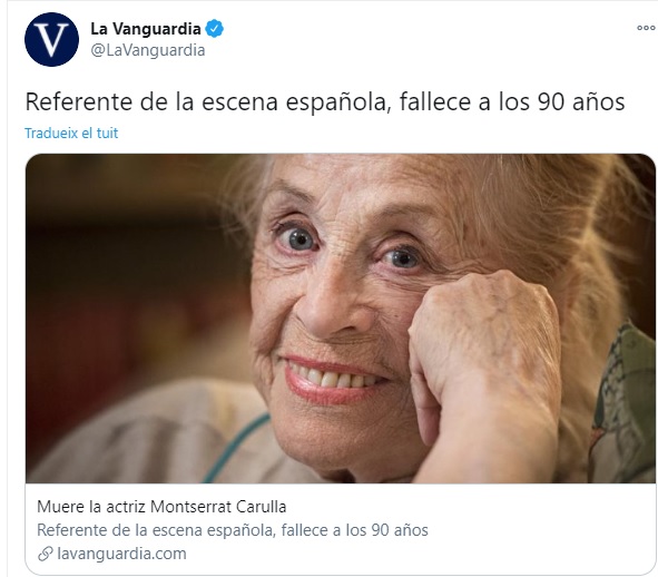 Trist al assabentar-me de la mort de la Montserrat Carulla. Gran actriu i compromesa amb la cultura, el país i la nostra llengua.