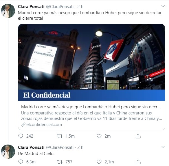 Clara Ponsatí s’ha escandalitzat pel fet que amb dades a la mà (dades de mitjans espanyols) altres regions del món havien tancat l’espai afectat mentre que Espanya no ho ha fet a Madrid, una actuació negligent i molt greu, a ulls dels experts, que més tard que d’hora el govern espanyol haurà d’assumir.