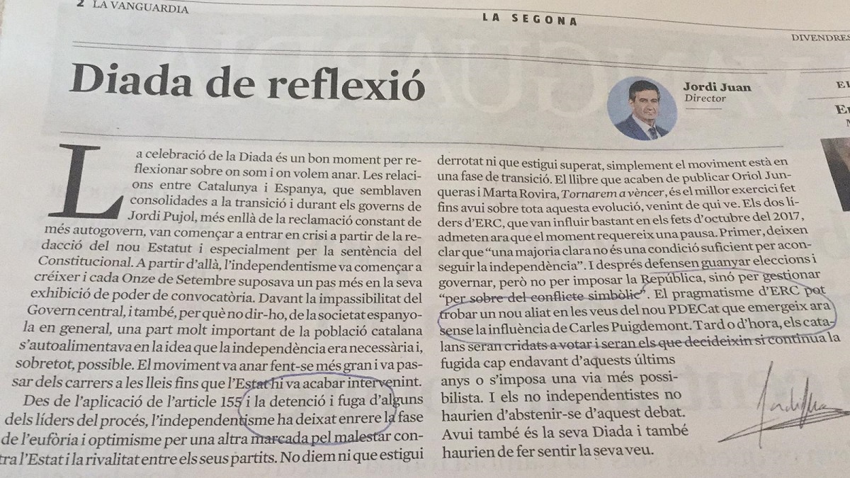El substitut de Màrius Carol com a director de La Vanguardia, en Jordi Juan, supera el seu antecessor i demostra que el canvi va ser una bona decisió de la família Godó. Els seus escrits són dignes d’un gran diari al servei d’Espanya.