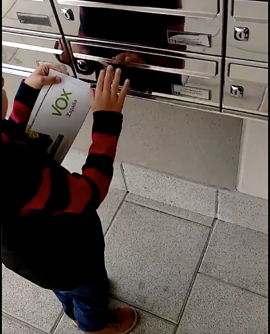 Es fa viral un vídeo on es veu un nen repartint propaganda electoral dels ultradretans de Vox en unes bústies mentre és animat per l’adult que l’acompanya. “Vinga tira-ho. Això per qui ho fem?”, li pregunta l’home que l’insta a actuar “sense titubejos i ferma”. I el nen respon: “Per Espanya”.