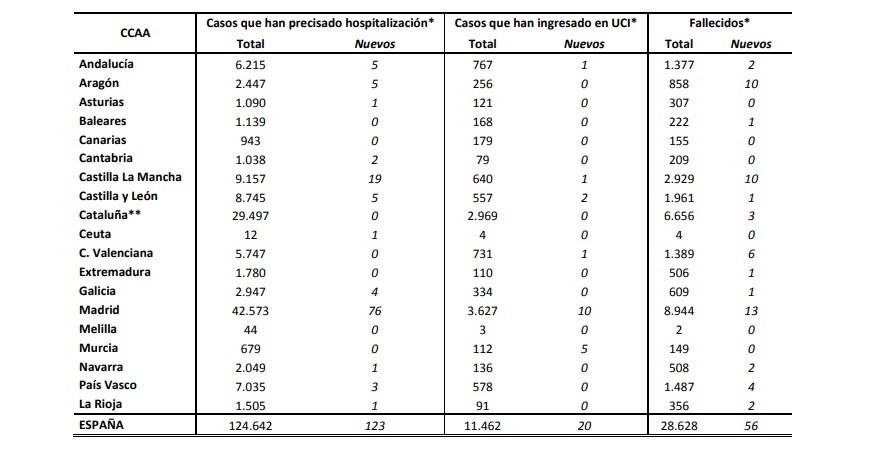 Només podem donar el percentatge, han tornat a canviar el model de dades, els casos de la regió de Madrid actius infectats tenen un taxa de 28,29, ahir 29,35, dels darrers 14 dies. Madrid amb 8.944, ahir 8.931 morts. La taxa sobre els 14 darrers dies a Catalunya es situa en el 23,43, ahir 31,93, i en morts el ministeri ha decretat un augment espectacular de mort amb un total de 6.656.
