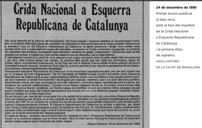 L’1 de novembre de 1986, un article de Josep-Lluís Carod-Rovira al diari Avui va ser el tret de sortida públic del moviment que va articular-se al voltant del manifest de la Crida Nacional a Esquerra Republicana de Catalunya, el manifest es va publicar el desembre del mateix any i va comptar amb una bona colla de líders independentistes, entre altres, Carod Rovira, Àngel Colom, Quim Monzó, Isabel Clara Simó, Carles Bonet, o l’actual conseller d’educació, Pep Bargalló.