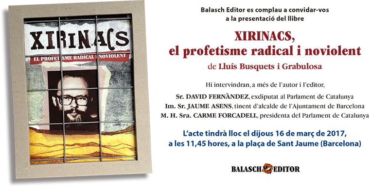 La presidenta del Parlament Carme Forcadell, Jaume Asens i David Fernández presenten el llibre-homenatge a Lluís Maria Xirinacs, publicat per Balasch Editor amb motiu dels deu anys de la seva mort.