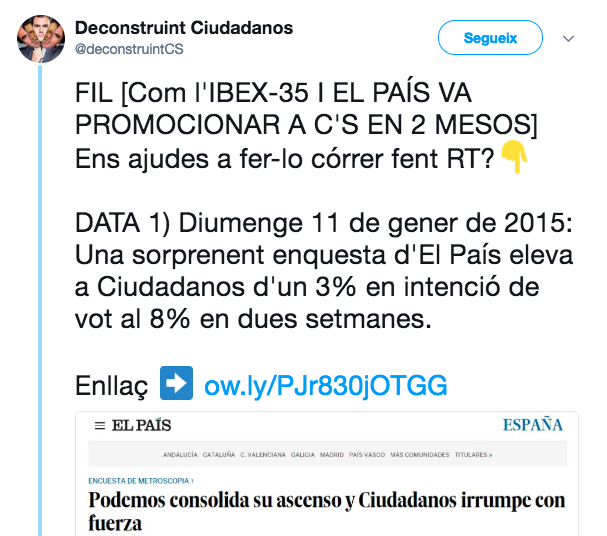 Ens ajudes a fer-lo córrer fent RT?DATA 1) Diumenge 11 de gener de 2015: Una sorprenent enquesta d'El País eleva a Ciudadanos d'un 3% en intenció de vot al 8% en dues setmanes.