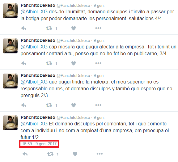 Albiol, no només s'oblida de les disculpes sinó que menysprea el dret a equivocar-se, ja que li sembla bé que l'empresa hagi fet fora algú que “insulta als seus clients” quan en realitat ell no va se-ho. Val a dir que, després de la sol·licitud de perdó del jove, Albiol va bloquejar-lo.