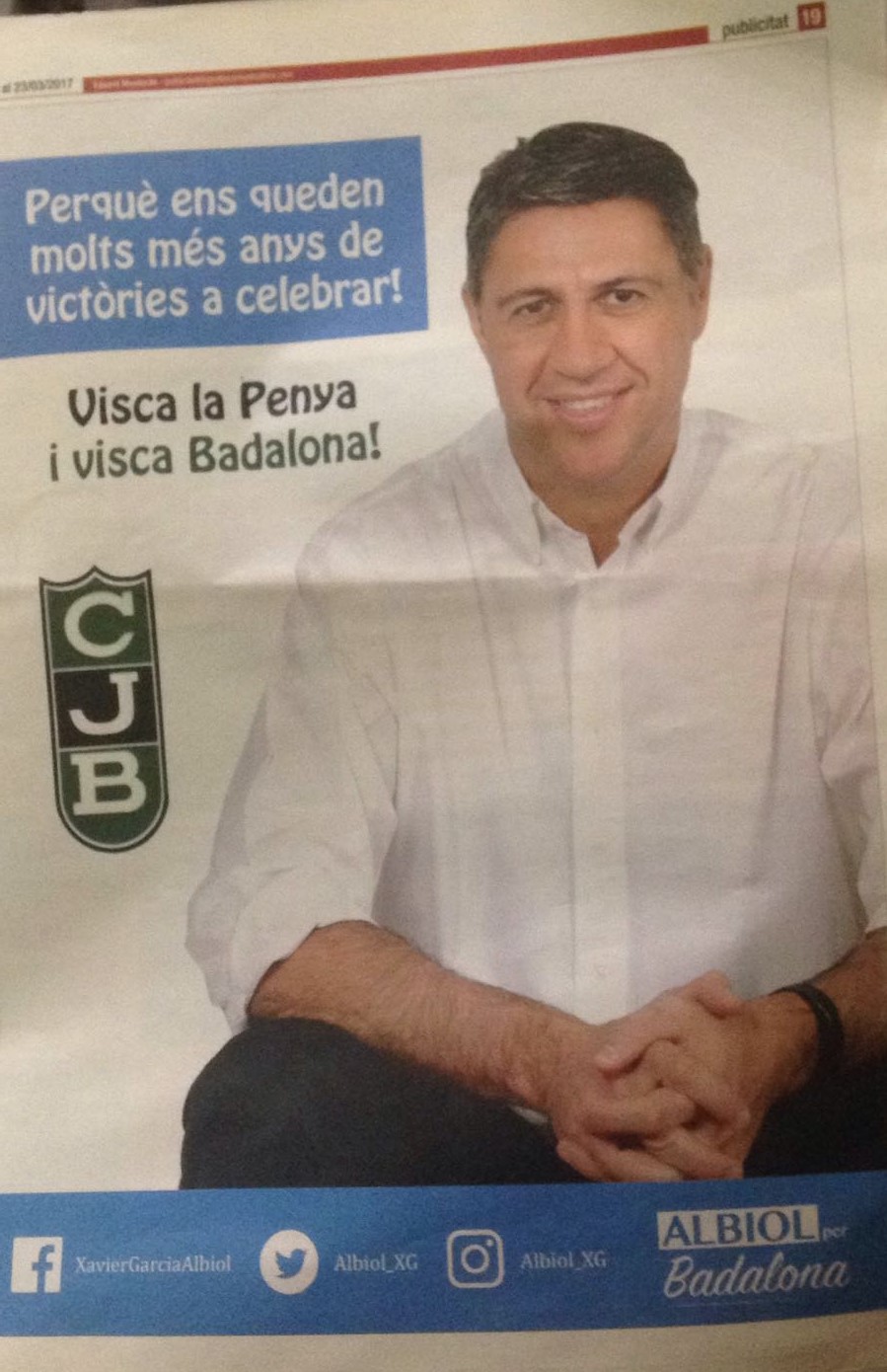 L'anunci, publicat al Diari de Badalona, que es reparteix gratuïtament, mostrava el popular amb un “perquè ens queden moltes victòries per celebrar” amb el logo del Club Joventut de Badalona (CJB) i totes les seves xarxes socials. En cap moment, cap referència al partit que milita, tot i usar els colors corporatius: el blanc i el blau cel.