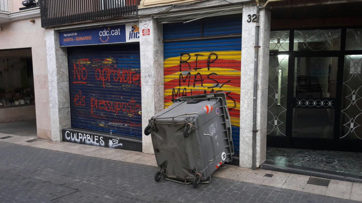 No és l’única pintada contra exconvergents, però. La seu de la secció local de CDC al districte d’Horta-Guinardó també ha aparegut amb un missatge contra l’expresident de la Generalitat, Artur Mas: “RIP Mas, mai més”. A més, també s’hi pot llegir: “No aprovarem els pressupostos, culpables”. Alhora, l’acció vandàlica s’ha complementat bolcant un contenidor d’escombraries a la façana de la seu de la formació.