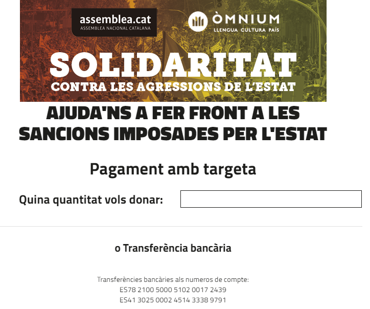 L'ANC i Òmnium Cultural han anunciat aquest dilluns l'obertura d'una pàgina web (www.caixadesolidaritat.cat), que han anomenat una 'caixa de solidaritat', per a aportacions econòmiques per ajudar les persones que siguin sancionades “per qualsevol poder de la justícia espanyola com a conseqüència d'un acte fet a les institucions del nostre país, ja sigui al Govern, al Parlament o als ajuntaments, o qualsevol ciutadà per una acció de llibertat d'expressió en el marc sempre de la no violència i de manera cívica”. Així ho ha explicat el president de l'ANC, Jordi Sànchez, en una roda de premsa.