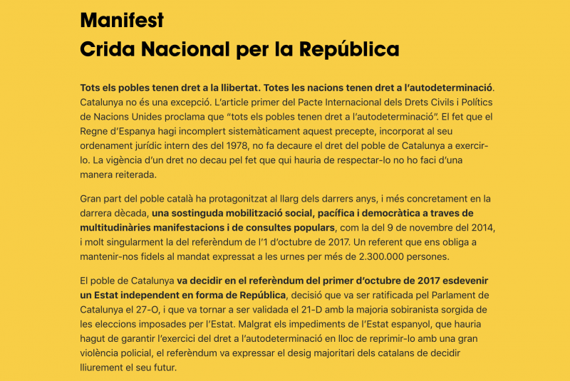 El poble de Catalunya va decidir en el referèndum del primer d’octubre de 2017 esdevenir un Estat independent en forma de República, decisió que va ser ratificada pel Parlament de Catalunya el 27-O, i que va tornar a ser validada el 21-D amb la majoria sobiranista sorgida de les eleccions imposades per l’Estat. Malgrat els impediments de l’Estat espanyol, que hauria hagut de garantir l’exercici del dret a l’autodeterminació en lloc de reprimir-lo amb una gran violència policial, el referèndum va expressar el desig majoritari dels catalans de decidir lliurement el seu futur.