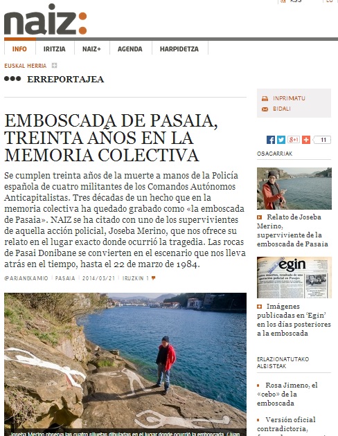 Era un 22 de març d’ara fa 30 anys a la costa de Pasaia, on quatre membres dels “Comandos Autónoms Anticapitalistas” van ser morts en una emboscada perfectament preparada, van utilitzar per fer-ho possible una militant detinguda dies abans, Rosa Jimeno, com a esquer.