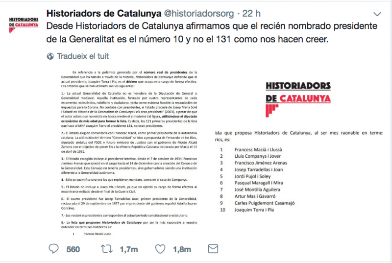 Desde Historiadors de Catalunya afirmamos que el recién nombrado presidente de la Generalitat es el número 10 y no el 131 como nos hacen creer. pic.twitter.com/S5CaAPQbWL