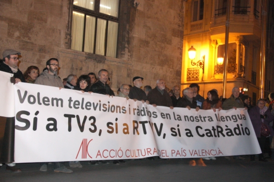 Sobre aquesta situació han posat èmfasi els organitzadors en els parlaments adreçats als manifestants. El portaveu del comitè d'empresa de RTVV, Vicent Mifsud, ha recordat que fa dos mesos que la Generalitat Valencia va decidir tancar Canal 9 i Ràdio 9 i evidenciat que en qualsevol autonomia els ciutadans tenen dret “a una cosa tan bàsica com posar la ràdio i televisió en la seva llengua, nosaltres no ho podem fer”. Mifsud ha dit que el govern valencià “posa barreres a qualsevol mitjà que no siga en valencià”.