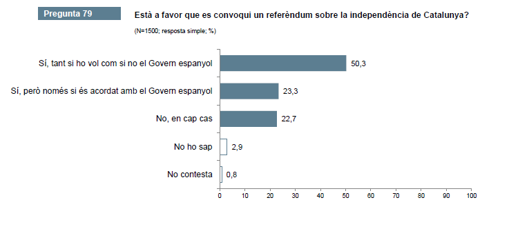 El CEO també revela que a la pregunta “Vol que Catalunya esdevingui un Estat independent” un 48,5% dels enquestats diu que No i un 44,3% diu que Sí, mentre que un 7,2% no ho sap o no contesta. Una contradicció aparent amb el sentit del vot en un referèndum, però que s'explica perquè del 44% del cens favorable a l'Estat propi, gairebé la totalitat aniria a votar afirmativament en un referèndum fins i tot no acordat. Però la resta es dividirien entre els vots del No (22,2%), blanc (6,2%) o nul (1,7%), l'abstenció (20,7%), i NS/NC (5,9%). Una de les conclusions que es podrien extreure de l'aproximació és que l'independentisme no té guanyada la partida, però que es podria imposar amb molta facilitat si el No continua negant la votació i no preparant una campanya pel plebiscit.