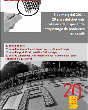 El 2014, la llei d’Unitat de Mercat augmenta l’impediment de la presència del català i la llei de defensa del consumidor votada pel PP i PSOE, contempla el doble d’articles impositius del castellà. Plataforma per la llengua fa un repàs dels clars i obscurs d’aquest 20 anys d’etiquetatge en català i explica que “El 5 de març del 1994 va acabar el termini d'adaptació de l'Estatut del Consumidor de l'any 1993. A partir de llavors els catalans teníem el dret de rebre la informació de l'etiquetatge i instruccions en català. Tanmateix l'aplicació no era real atès que calia abans desenvolupar un reglament que preveia el mateix Estatut del Consumidor. El Govern català mai no va desenvolupar el reglament i no fou fins el 2010 que, amb el nou Codi de consum, finalment el dret i l'obligació a les empreses són reals. Així i tot, moltes empreses encara no s'hi han adaptat i l'incompliment és força generalitzat.”