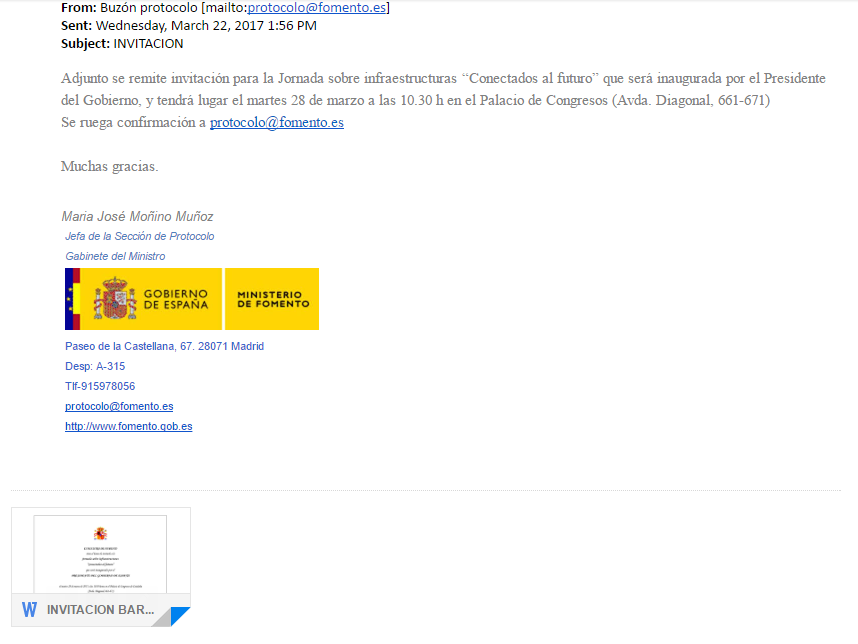 La invitació adjunta a un correu electrònic signada per la cap de la secció de protocol del ministeri de Foment, María José Moñino Muñoz –que, alhora, és alcaldessa del municipi de Fuente el Saz de Jarama–, és un document Word editable. Un format poc ortodox perquè es pot manipular fàcilment i depèn de la versió del programa que es tingui podria desquadrar-se. De fet, els formats més habituals en aquest cas podrien ser el .PDF o qualsevol format d’imatge (.JPG, .PNG…).