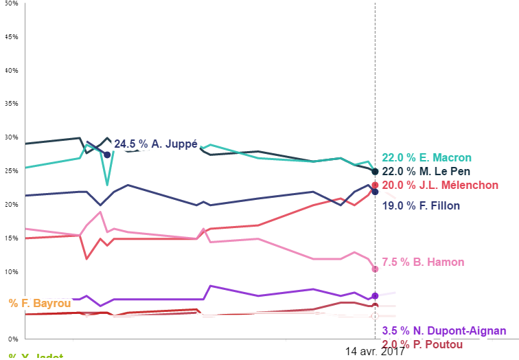 La televisió privada BFM TV posa a disposició una aproximació sortint de la mitjana de les principals enquestes publicades que situava divendres passat Mélenchon amb un 20% de sufragis, 3 punts més que fa dues setmanes i vuit punts més que fa tot just un mes. Macron i Le Pen anaven a la baixa des del març passat i, del 26%, tots dos se passaven divendres en el 22%, mentre que Fillon es quedaria en el 19%. En l’actualització d’ahir Mélenchon veia el seu ascens truncat i es quedava en el 18%, però en qualsevol cas és evident que la lluita per passar a la segona ronda ja no és cosa de dos, Macron i Le Pen, ni de tres, comptant el conservador François Fillon.