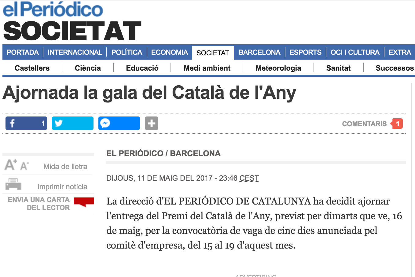 Amb l'ajornament de l'edició d'enguany El Periódico constata el seu fracàs editorial en favor de l'unionisme. La gala, prevista per dimarts vinent, ha estat suspesa per la convocatòria de vaga de cinc dies anunciada pel comitè d'empresa, del 15 al 19 d'aquest mes, que lluita per evitar una rebaixa del 20% dels salaris dels treballadors.