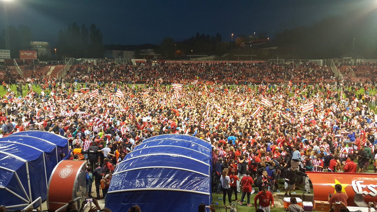 Paral·lelament, la plaça de Catalunya de Girona ha estat el punt neuràlgic de celebració de l'ascens a Primera Divisió amb petards, bengales, bufandes al vent i càntics. La celebració oficial de la fita està prevista que se celebri aquest dilluns 5 de juny a la tarda, amb una rua de l'equip pels carrers de Girona i la tradicional rebuda institucional a l'Ajuntament.