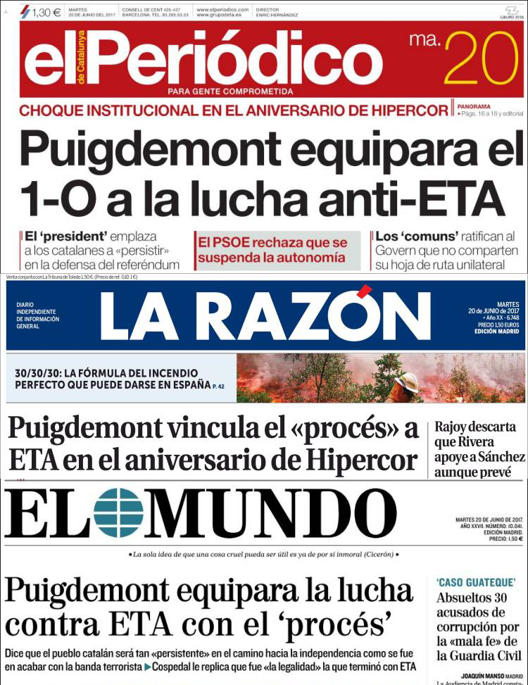 Avui el lector unionista pot escollir: 'Puigdemont equipara l'1-O amb la lluita anti-ETA' (El Periódico), 'Puigdemont vincula el procés amb ETA en l'aniversari d'Hipercor' (La Razón) i 'Puigdemont equipara la lluita contra ETA amb el procés' (El Mundo). Els diaris nacionalistes espanyols, que obliden completament la crida del president de la Generalitat, Carles Puigdemont, a la “unió” i “coordinació” de les forces policials per lluitar contra l'amenaça terrorista global durant l'acte d'homenatge a les víctimes de l'Hipercor, s'agafen a unes paraules del president on demanava “persistir” en el procés en un acte amb membres de la Comissió Jurídica Assessora de la Generalitat durant el matí.
