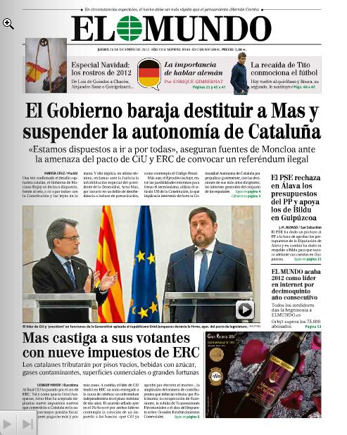 Un dia més, l'acord de governabilitat de CiU i ERC és protagonista a les portades, però des de visions ben diferents. El diari 'Ara' titula “Compromesos”, i 'El Punt Avui' -en totes dues edicions-, “Pacte d'estat”. 'La Vanguardia' obre amb “Mas i Junqueras firmen en la tardor del 2014 en l'horitzó” i 'El Periódico' destaca una entrevista al líder d'ERC, Oriol Junqueras, titulada: “L'objectiu és eliminar les retallades ideològiques”. Des de Madrid, 'El País' subratlla que “Rajoy moviliza todos sus recursos para asfixiar el pacto CiU-ERC”. 'El Mundo' va més enllà: “El Gobierno baraja destituir a Mas y suspender la autonomía de Catalunya”. “Una quimera ilegal”, diu 'Abc'.