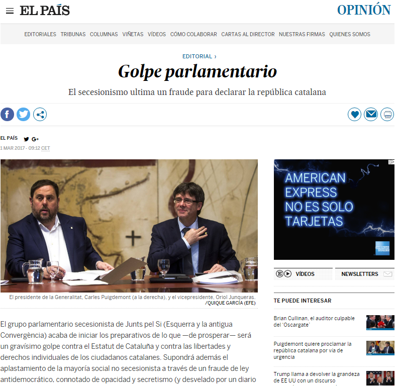 El País esmenta el suposat atac a l’Estatut que implicaria la reforma del reglament del Parlament però no recorda en cap moment si la sentència del TC contra la llei autonòmica catalana el 2010 va suposar o no una agressió a la democràcia. De fet, recuperant l’editorial del mateix diari del 29 de juny de 2010, la jornada després que es conegués la decisió final de l’Alt Tribunal, la coherència és absoluta. “Aval a l’Estatut”, es titulava l’article, que en el seu interior rebaixava la transcendència del que havia dit el TC: “Més enllà del debat terminològic, el fons del text sembla escassament modificat i fa desaparèixer els pitjors auguris d’una gran retallada”.