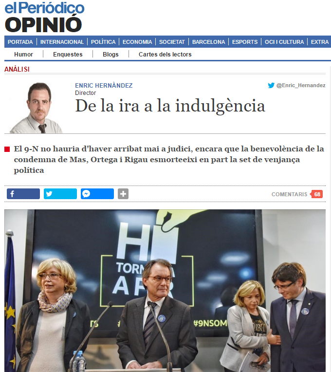 D’altra banda, l’editorial de La Vanguardia creu que tot i el sonor cop de porta dels tribunals a un procés participatiu que no arribava ni a consulta, “la legalitat no pot ser violentada, però el pacte polític és més necessari que mai”. A més, el text no creu necessari fer un referèndum per afirmar: “No hi ha una majoria social rotundament rupturista”. El director del rotatiu, Màrius Carol, expressa en un article un dilema entre legalitat i justícia, però no va més enllà i no insinua que la sentència dóna legitimitat per superar la llei espanyola.