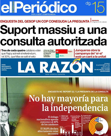 Ahir va ser El Periódico, el primer en fer una enquesta, però les presses són males companyies i malaguanyats diners per acabar manipulant els resultats de l’enquesta a la portada. Avui els mitjans de la caverna han seguit els passos d’El Periódico i han publicat enquestes cuinades des del despatx de Pedro J Ramírez i del de Paco Marhuenda, per fer creure que el sísí està perdut, moltes molèsties es prenen els que diuen que al consulta no es farà i que no creuen amb el dret a decidir i la democràcia dels catalans. La formula però els serveix només per fer creure als seus lectors una falsa realitat i a Catalunya pot tenir l’efecte contrari al que pretenen.
