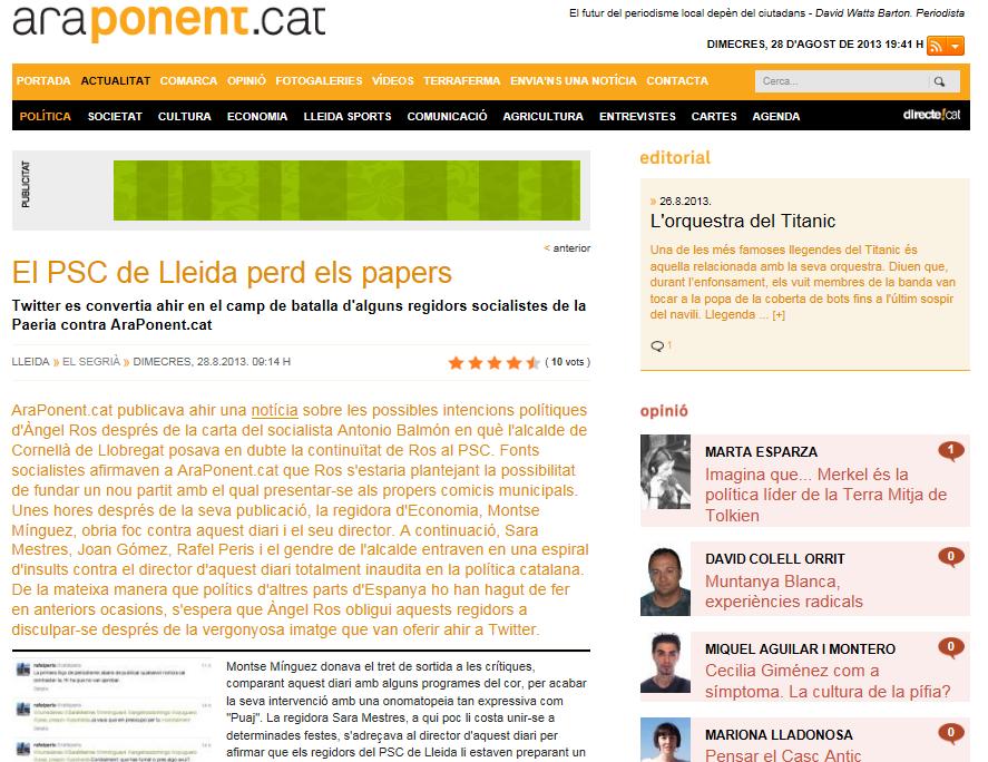 En darrer terme, el gendre d'Àngel Ros i, al mateix temps, cap de gabinet de l'alcaldia, José Crespín, es posava una vegada més en la vida íntima del director d'AraPonent.cat mitjançant atacs personals, la qual cosa és d'una gravetat fora de dubte, més si tenim en compte el seu càrrec i, també, que la vida personal del director d'aquest diari no té cap mena de conseqüència ni influència en la societat lleidatana, a diferència de la seva.