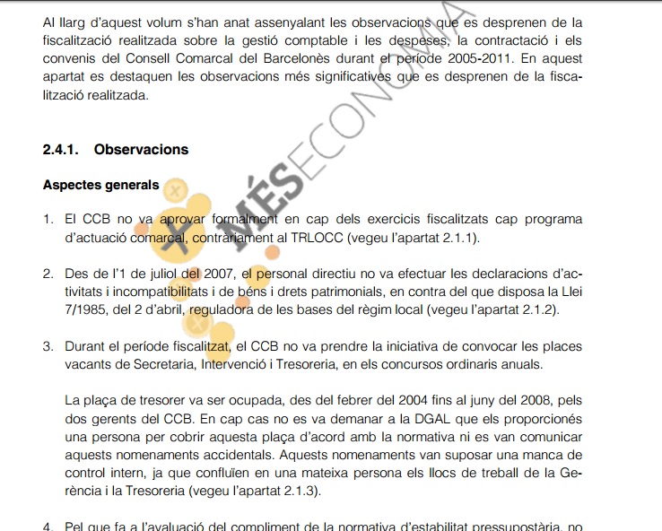S’hauria d’haver demanat al Departament de Governació i Relacions Institucionals de la Generalitat que es proporcionés una persona per cobrir aquesta plaça d’acord amb la normativa, i apunta que els nomenaments “suposaven una manca de control intern, ja que confluïen en una mateixa persona els llocs de treball de la Gerència i la Tresoreria”.