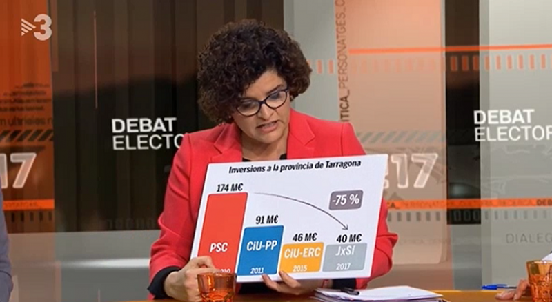 En un moment que es parlava sobre els efectes negatius que té sobre l'economia de la província de Tarragona l'oblit de les inversions estatals, la candidata del PSC a Tarragona, Rosa Ibarra, va voler capgirar l'argument: segons la socialista, els problemes no només són per la manca de cura de l'Estat espanyol a Tarragona sinó també de la Generalitat de Catalunya.