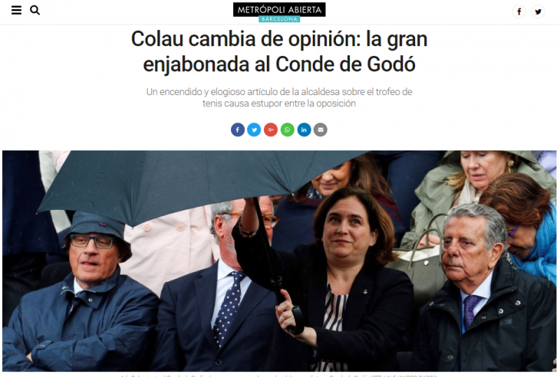 Ada Colau ha traspassat l'estricte protocol que li pertoca com a alcaldessa de Barcelona i s'ha acostat als poders fàctics que tan havia criticat. Així ho va voler demostrar en un article a La Vanguardia on apartava les diferències passades amb el Conde de Godó i li dedicava tota lloança possible: amb l'excusa de lloar la pràctica històrica del tennis a Barcelona, queien suculentes perles a favor dels Godó: “Algunes de les millors raquetes del món es reuniran de nou a la nostra ciutat per disputar l'Open Barcelona Banc Sabadell-Trofeu Comte de Godó, la gran cita esportiva de la primavera” o “L'Open Barcelona Banc Sabadell-Trofeu Comte de Godó és una d'aquestes fites imprescindibles que ens consoliden com a capital de l'esport i ens ratifiquen com a ciutat dinàmica i emprenedora” i fins i tot un “El Godó, a més, és un trofeu únic, ja que en cap altre lloc un campionat d'aquestes característiques és organitzat per un club de ciutat”.