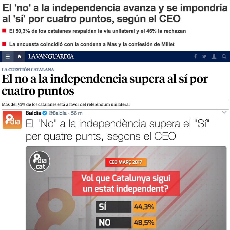 El baròmetre del Centre d'Estudis d'Opinió és molt clar, un 66% dels catalans votaria 'sí' si demà es fes un referèndum independentista amb una participació del 74%, més que suficient perquè sigui vinculant, i on només un 34% diria 'no' a què Catalunya tingués plena sobirania. Si el referèndum fos unilateral, un 43,3% votaria 'sí', un 22,2% posaria la papereta del 'no' i un 20,7% no aniria a votar. Les dades, per tant, són molt clares. Tanmateix, els diaris unionistes s'agafen a una pregunta en concret que fa el CEO, 'Voleu que Catalunya es converteixi en un estat independent?' sense concretar si és una votació en un referèndum, si la resposta és vinculant ni si hi ha negociació o no amb l'Estat. És aquí, on el 'no' guanya amb el 48,5% contra el 44,3% del 'sí' que mitjans com El Periódico, La Vanguardia i 8TV aprofiten per titular que la independència perd.