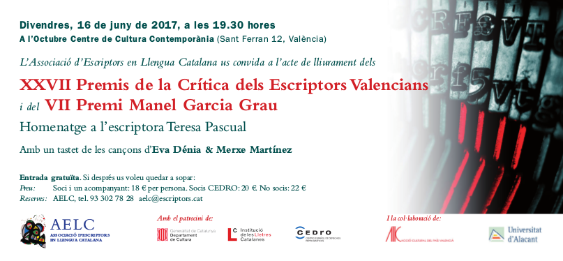 La nit dels Premis de la Crítica tindrà lloc aquest divendres 16 de juny a l'Octubre Centre de Cultura Contemporània, a València, en el transcurs d'una vetllada en la qual s'homenatjarà l'escriptora Teresa Pascual. La poeta i activista cultural Mariola Nos presentarà el lliurament dels Premis, una vetllada amb tastet de cançons d'Eva Dénia & Merxe Martínez, i un homenatge a l'escriptora, amb un parlament a càrrec de Neus Aguado i un vídeo sobre la trajectòria de l'escriptora elaborat per la Universitat d'Alacant.
