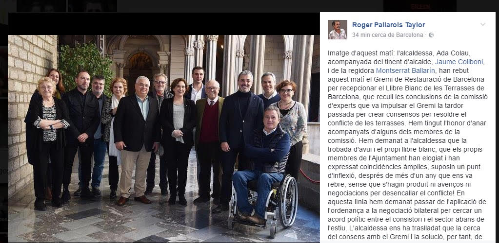 La trobada sembla que avergonyeix al socialista Jaume Collboni, l'investigat per tràfic d'influències en una peça del cas Mercuri ha amagat que Pilar Rahola formés part d'aquesta trobada publicant a Instagram i Facebook una versió retallada de la instantània just en l'espai on ella hi apareix, juntament amb Eduard Voltas i altres membres del 'Llibre blanc de les terrasses de Barcelona'.