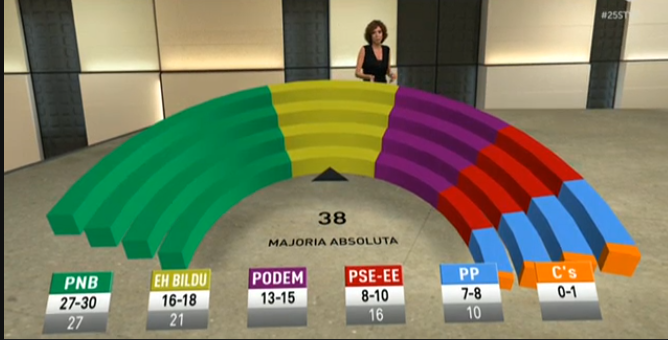 Així, l’aproximació dóna entre 27 i 30 escons al PNB, a prop dels 38 que dóna la majoria absoluta. Un dels interrogants és si la formació nacionalista sumaria amb els socialistes, amb una forquilla de 8-10 representants, o també hauria de fer ús del PP –entre 7 i 8 diputats-, cosa que podria influir en la governabilitat espanyola. Bildu tindrà, segons l’enquesta, entre 16 i 18 membres al parlament, cosa que li asseguraria el segon lloc. Podemos no aconseguiria els resultats que li donaven les enquestes més optimistes i es quedaria amb entre 13 i 15. Ciudadanos té opcions d’entrar a la cambra, amb un escó com a molt.