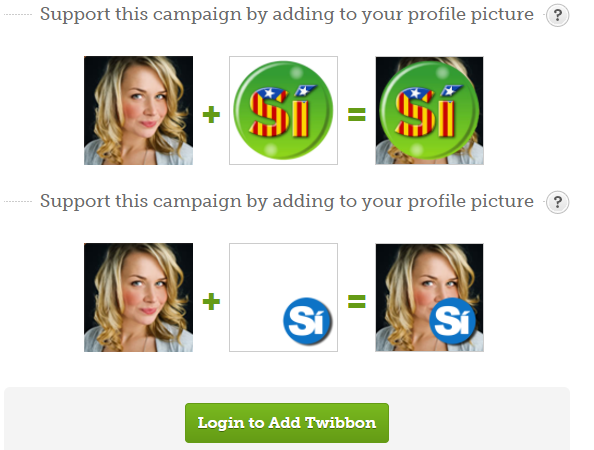 Aquí hi ha una primera opció, un 'Sí' de color blanc sobre fons blau. Qui vulgui un 'Sí' més pintoresc té aquesta segona opció amb un sí amb l'estelada sobre fons verd. Un cop es logueja amb el Facebook o Twitter la foto queda actualitzada amb el botó corresponent.