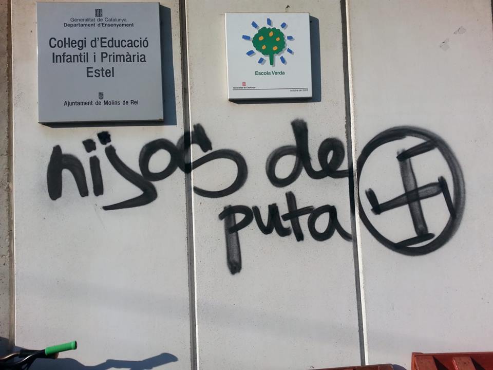 Tot això és el que s'han trobat els nens i nenes que han anat avui a classe a l'Escola Estel de Molins de rei. La cup de la localitat del Baix llobregat ha explicat que els fets s'han produït aquesta nit i és un acte vandàlic que coincideis “els atacs que està rebent l'Escola Catalana per part d'organitzacions com el Cs, PP, SCC i altres grups de l'extrema dreta amb la cobertura de la Justícia espanyola”.