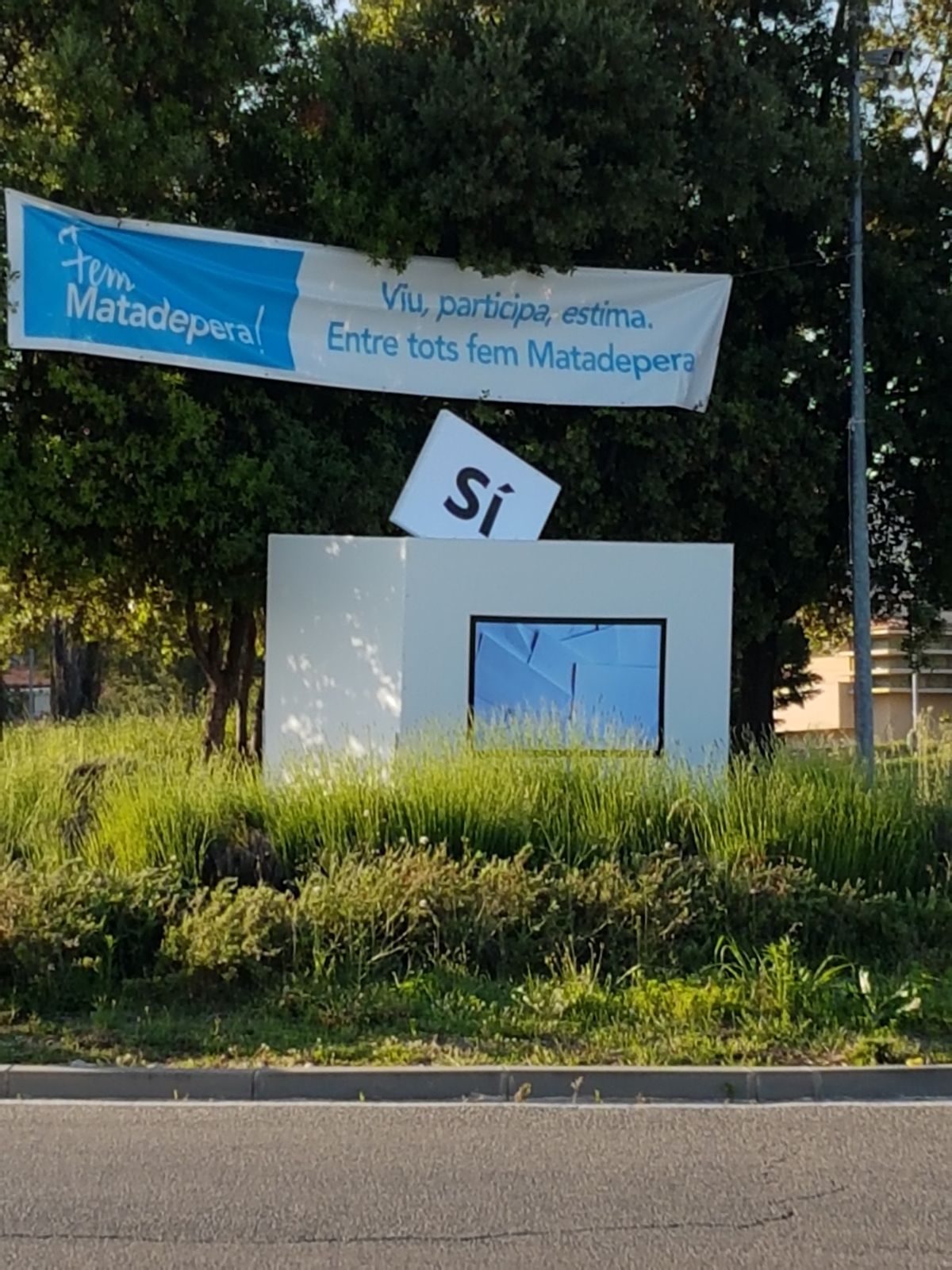 Tot just fa una setmana que l'ANC de Matadepera va inaugurar tres urnes gegants per a fer campanya a favor del referèndum. Però les urnes blanques impol·lutes han durat ben poc. La que està col·locada a la carretera que condueix cap a Mura, ha patit dos atacs en 7 dies. Primer de tot, unionistes ultres passats de voltes es van carregar el vinil que era la part transparent de l'urna. Avui mateix ha aparegut amb pintades en contra dels independentistes. Com es pot veure, els atacants no han sabut dibuixar correctament l'esvàstica nazi, un fet que diu molt del coeficient intel·lectual dels vàndals.