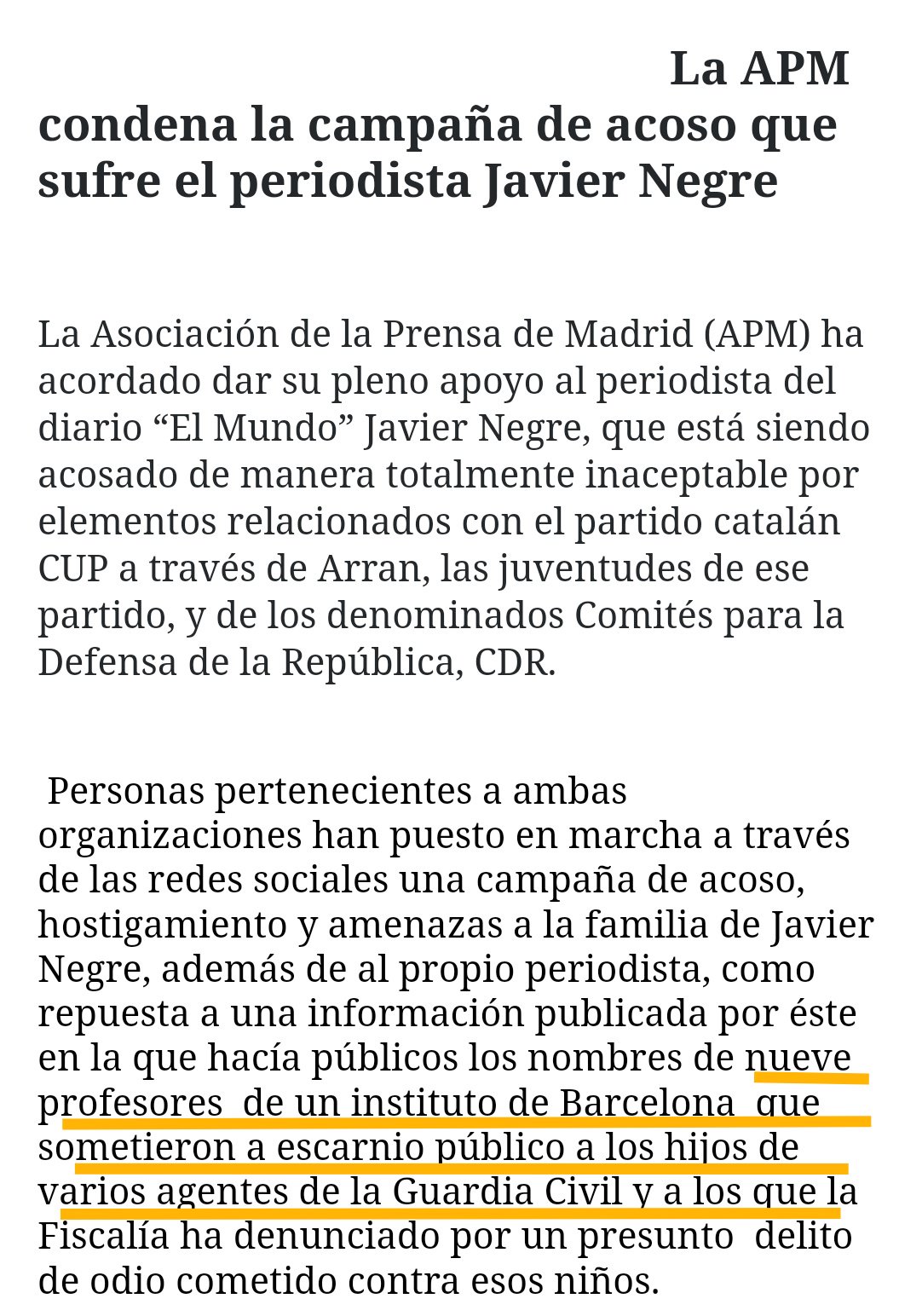 Com ja ho ha fet el Gobierno, l'associació ha remès un comunicat on no només mostra el seu suport al periodista del diari nacionalista El Mundo, Javier Negre, que fa una setmana acusava el professor Josep Lluís Alcázar de l'institut de participar en una xerrada dels CDR, confonent els Comitès de Defensa de la República amb els Comitès de Defensa de la Revolució de Tunísia, qui va organitzar un acte en suport al poble tunisià i en contra de la dictadura de l'expresident Ben Alí, sinó que també es posiciona.