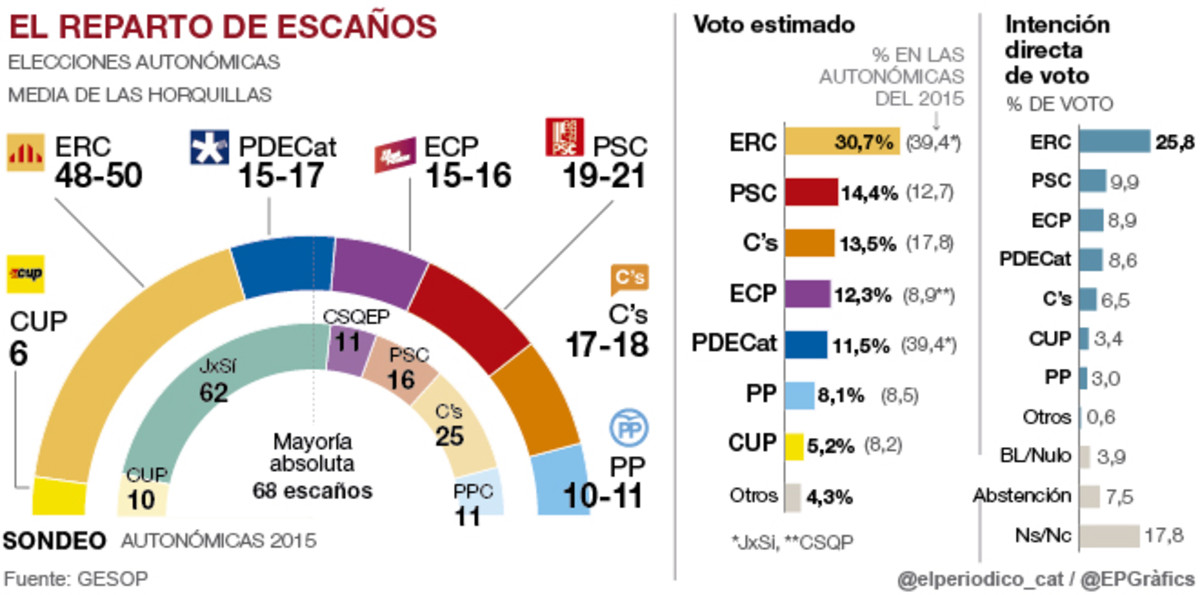 Esquerra Repúblicana arrasaria en unes hipotètiques eleccions, amb 50 diputats, el millor resultat de la seva història, contrastaria amb la caiguda lliure del PDECAT, que amb 17 diputats demostra que el partit, encara en plena reconstrucció, té molt recorregut per endavant. La CUP, per la seva part, tindria 6 representants que consolidarien la majoria absoluta independentista de 73 diputats, un més dels 72 actuals. Unes dades que doten de més força l'opció de la República catalana que comptaria amb una oposició liderada per Ciutadans, amb 18 diputats, que registraria una caiguda de 7 diputats.