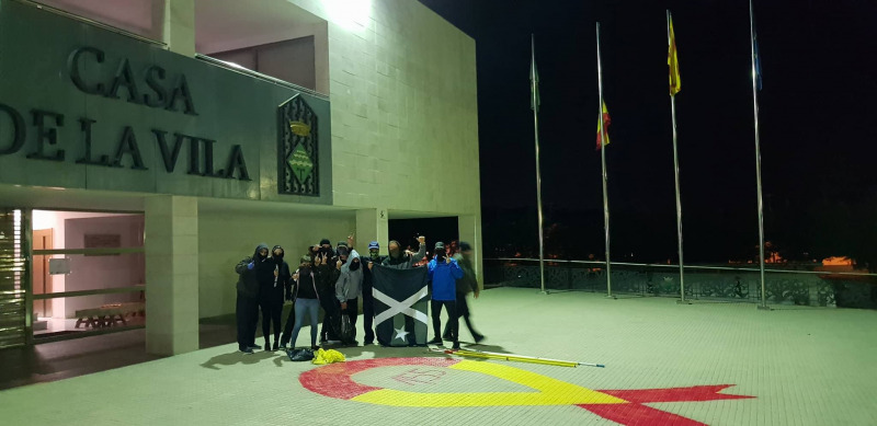 Segons han difós a la xarxa, una quinzena de persones ha despenjat aquesta matinada la bandera negra (que havia estat col·locada enlloc de l'espanyola aquest dissabte) i l'Ajuntament ha tornat a hissar la 'rojigualda'.