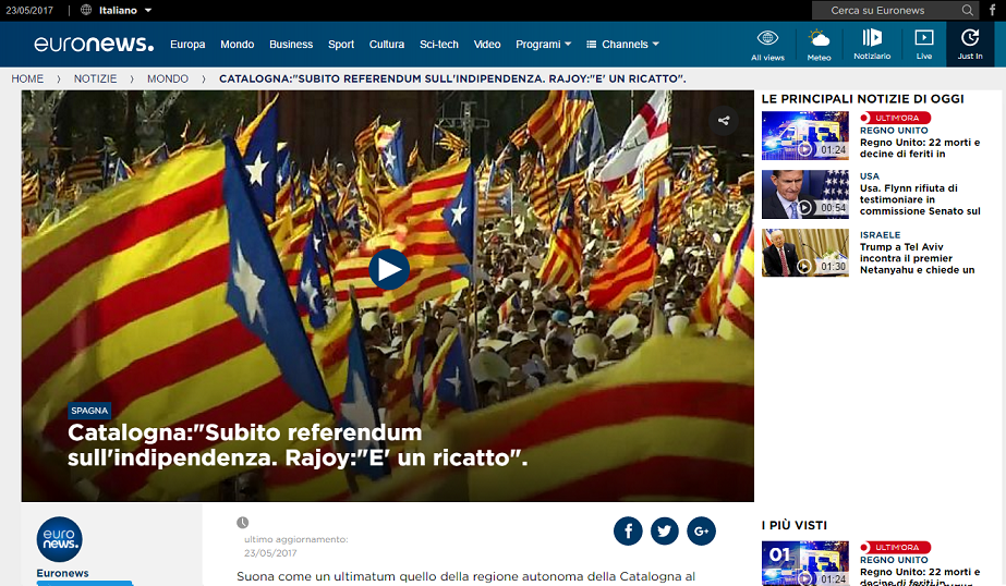 Euronews (Internacional)– “Catalunya: Referèndum d’independència immediat. Rajoy: És un xantatge”: la cadena de notícies europees s’ha fet ressò de tota la jornada d’ahir en les diverses edicions, com la italiana o la francesa. En la primera edició, es recullen les declaracions de Puigdemont a la conferència d’ahir per davant de la reacció de Rajoy, i les filtracions d’El País no apareixen. En la segona, s’inclou un vídeo on apareix la manifestació de la Falange i declaracions del president català, seguides de paraules de Rajoy i d’un context sobre el procés, en el qual es diu que “el 48% de catalans no volen marxar d’Espanya”. La versió anglesa parla d’un “punt mort” en el debat independentista. Euronews també s’ha fet ressò de l’acte en rus i en portuguès.